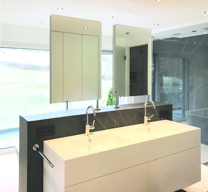 Einbaukonzept ermöglicht vielfältige Anpassungen wie variable, matte Waschtischplatten mit integrierten Handtuchhaltern