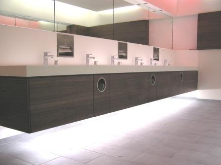Wir bauen Ihre Reihenwaschtischanlage. Rechteckig in Nische, L-Form oder U-Form. In jedem Fall nach Maß.